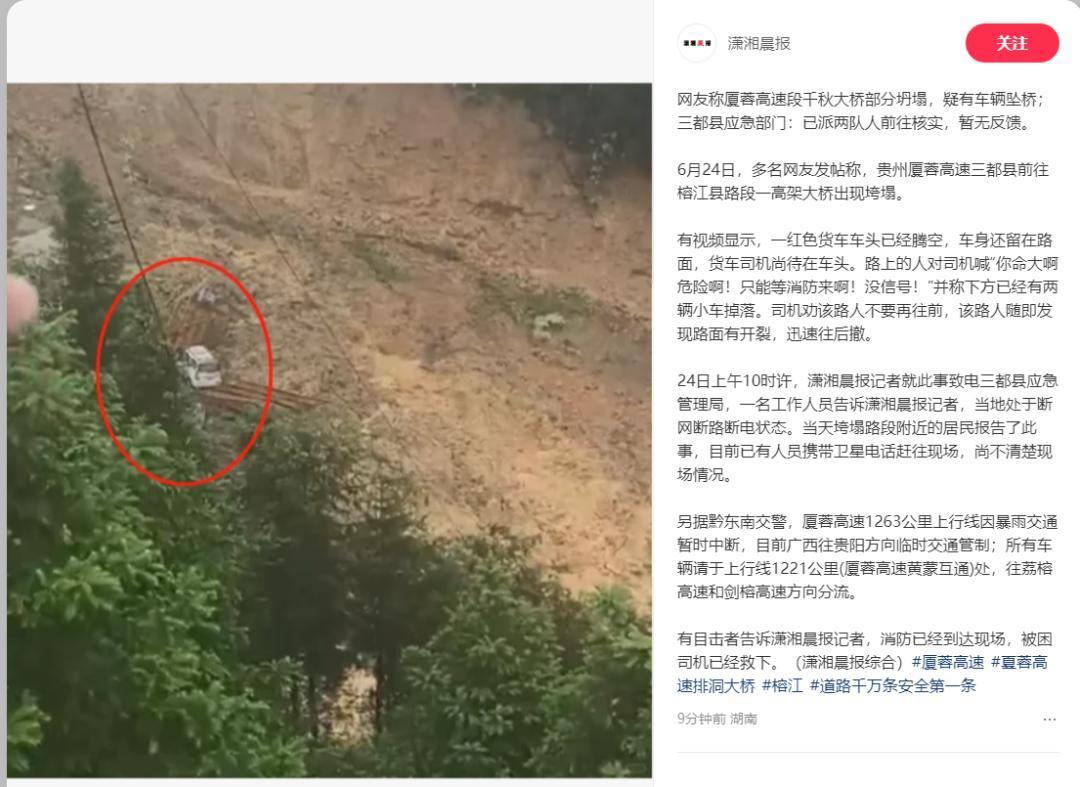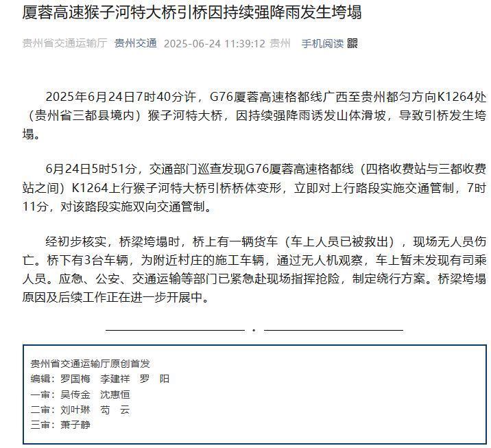 随后,官方通报:2025年6月24日7时40分许,G76厦蓉高速格都线广西至贵州都匀方向K1264处(贵州省三都县境内)猴子河特大桥,因持续强降雨诱发山体滑坡,导致引桥发生垮塌。6月24日5时51分,交通部门巡查发现G76厦蓉高速格都线(四格收费站与三都收费站之间)K1264上行猴子河特大桥引桥桥体变形,立即对上行路段实施交通管制,7时11分,对该路段实施双向交通管制。经初步核实,桥梁垮塌时,桥上有一辆货车(车上人员已被救出),现场无人员伤亡。桥下有3台车辆,为附近村庄的施工车辆,通过无人机观测,车内无人员。应急、公安、交通运输等部门已紧急赴现场指挥抢险,制定绕行方案。桥梁垮塌原因调查及后续工作正在进一步开展中。————————————来 源:大河报·豫视频记者 杜倩雯